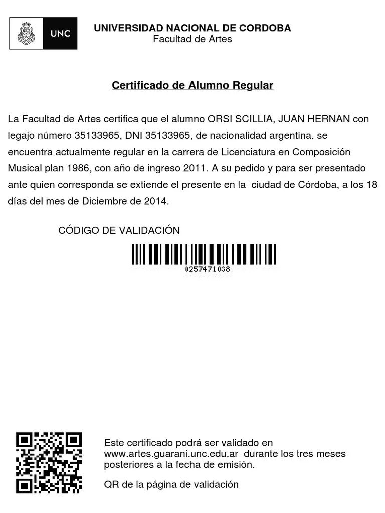 Es un identificador personal y único que permitirá, en el futuro, acceder a todos los servicios de la universidad... Facultad de artes universidad nacional de córdoba +54 351 5353630 www.artes.unc.edu.ar.. Se informa que ante la permanente circulación de correos electrónicos que solicitan los datos de acceso al sistema guaraní, para validar y corroborar los datos, el equipo central guarani (psi).